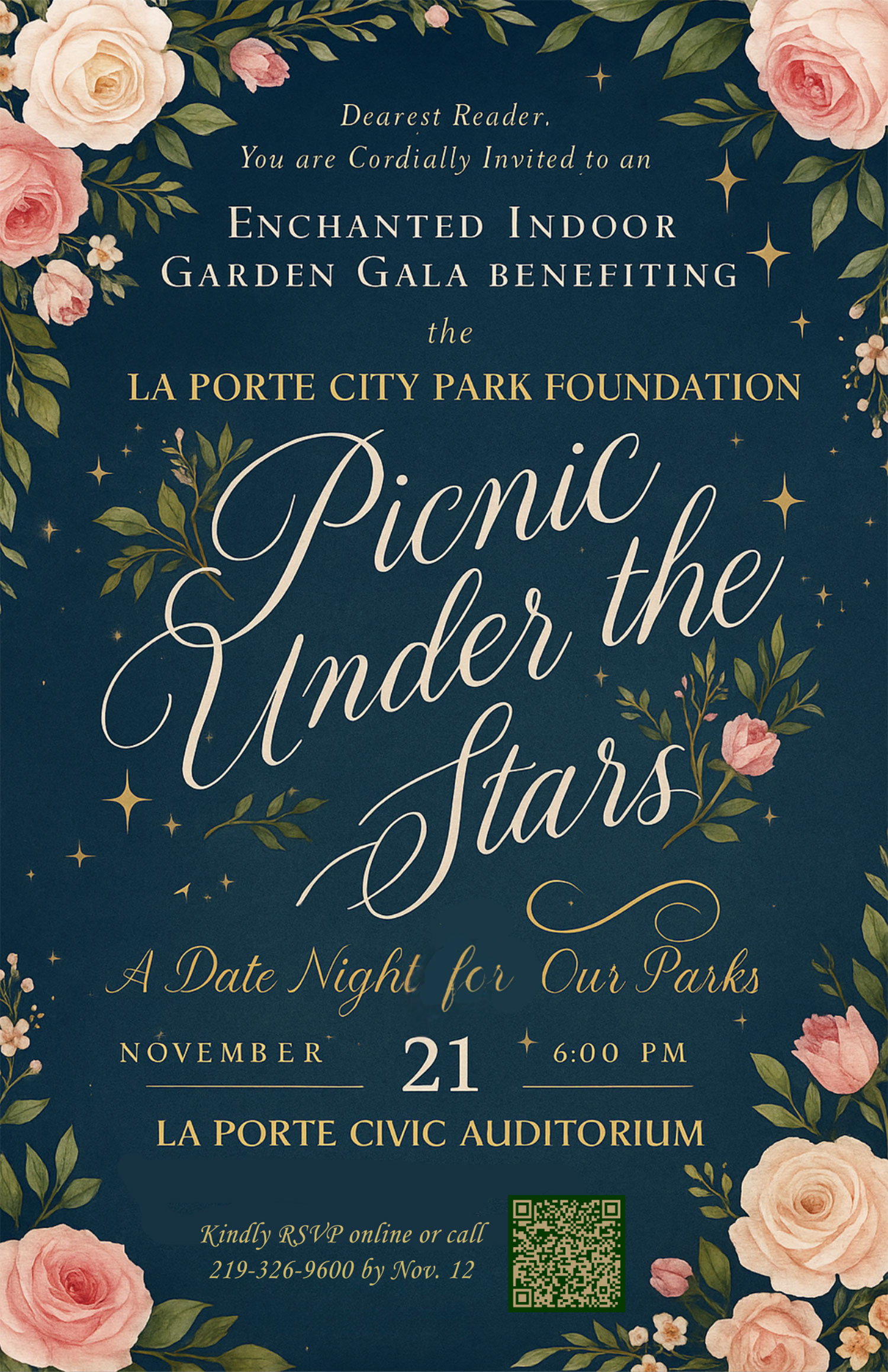 The La Porte City Park Foundation is pleased to announce the return of its annual “Picnic Under the Stars” Gala, taking place on Friday, November 21, 2025, from 6-10 p.m. at the La Porte Civic Auditorium. This year’s event will feature a romantic, garden-inspired atmosphere with music, art and meaningful community connection—all in support of La Porte’s parks.